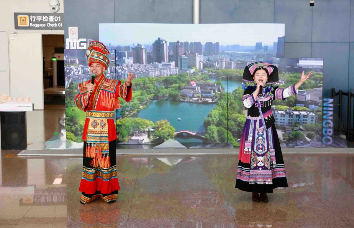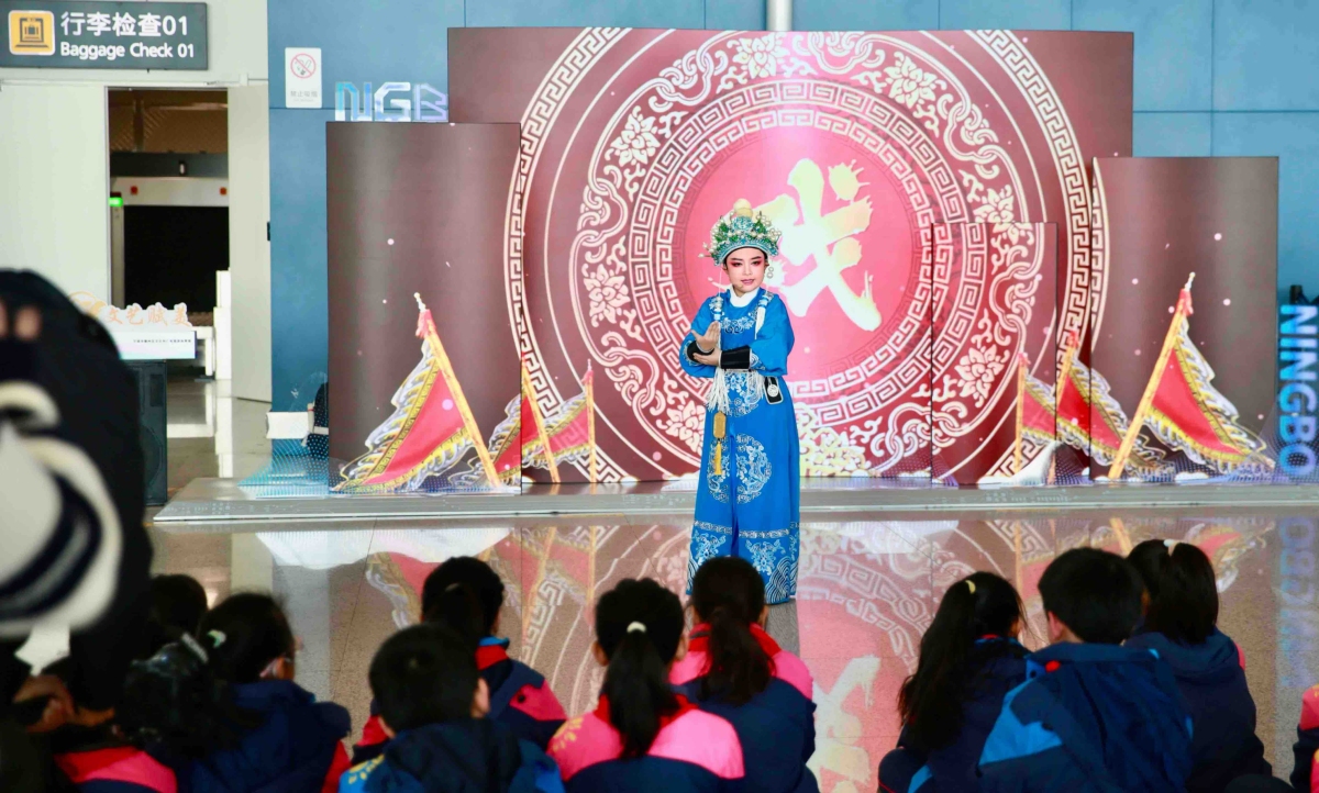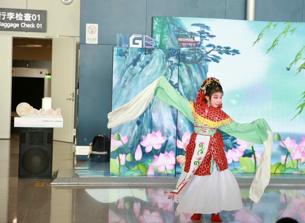 活动现场,宁波机场邀请了鄞州区文化特派员张满连和明楼街道宁歌少儿艺术培训学校的小演员郑婷月、陈玥,他们身着精美服饰,在候机大厅内伴随着悠扬的乐声缓缓开演。